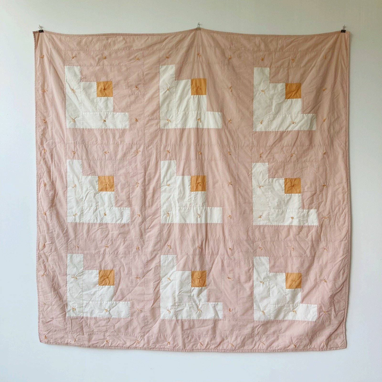 Beautiful pale pink binding and backing, organic cotton batting.