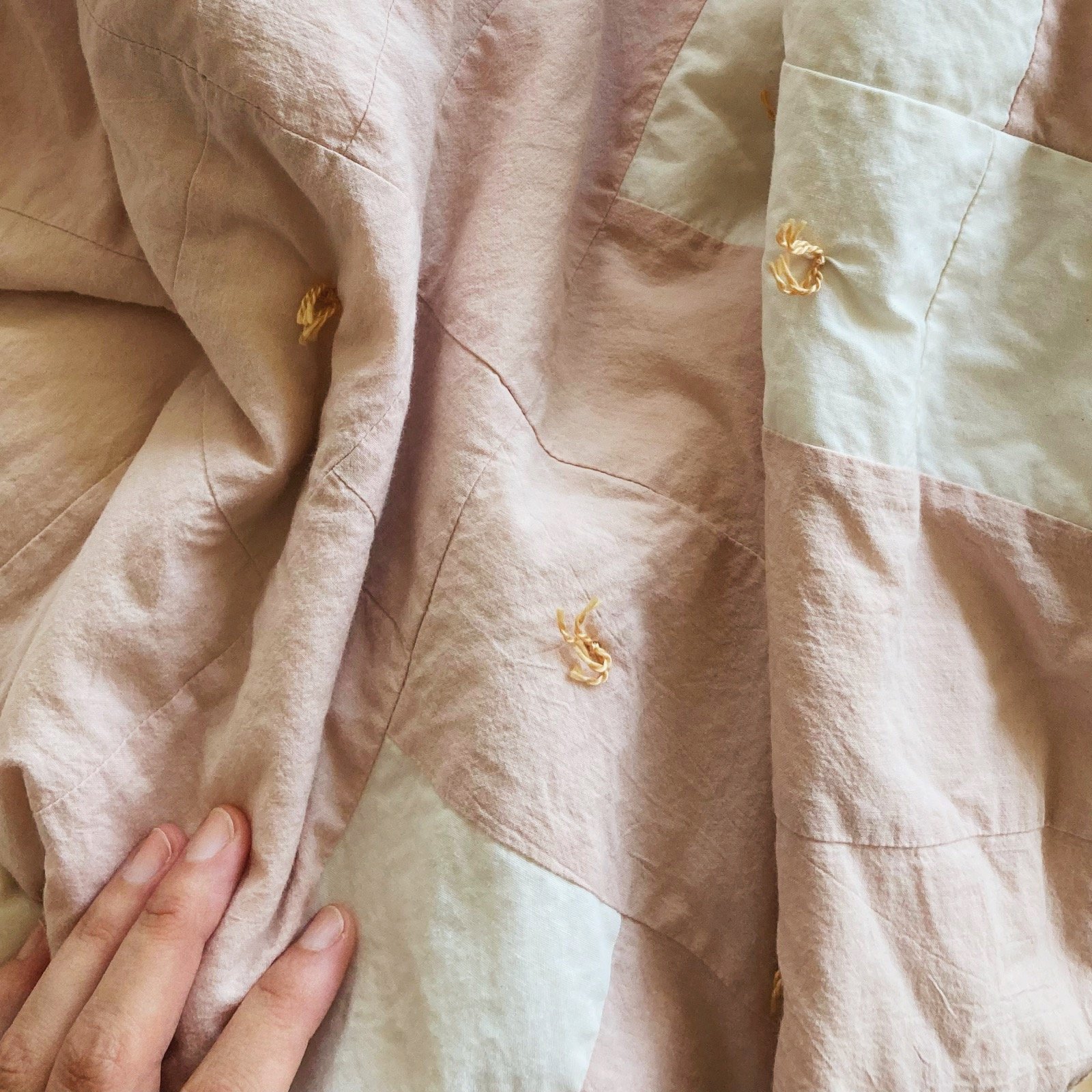 This quilt is made entirely from the softest cottons. The layers are tied together with tan cotton floss, keeping the whole quilt lightweight and snuggly.