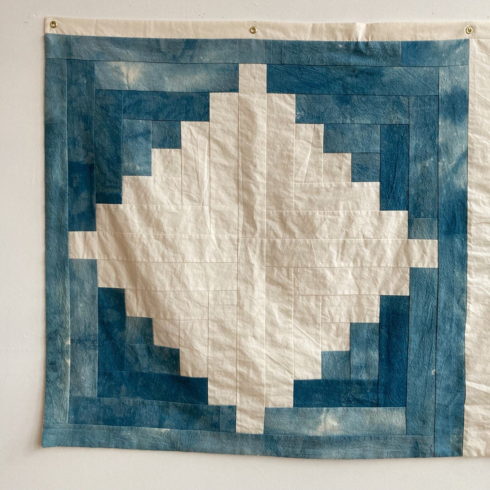 Log cabin quilt wall hanging, made from unbleached cotton and indigo hand-dyed cotton floursack. Backed with cotton muslin.