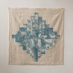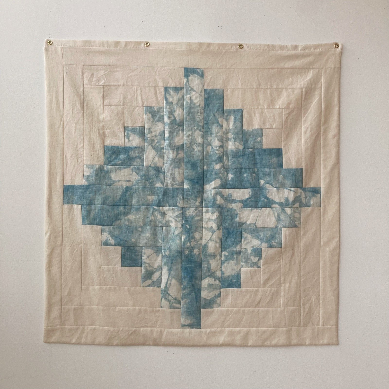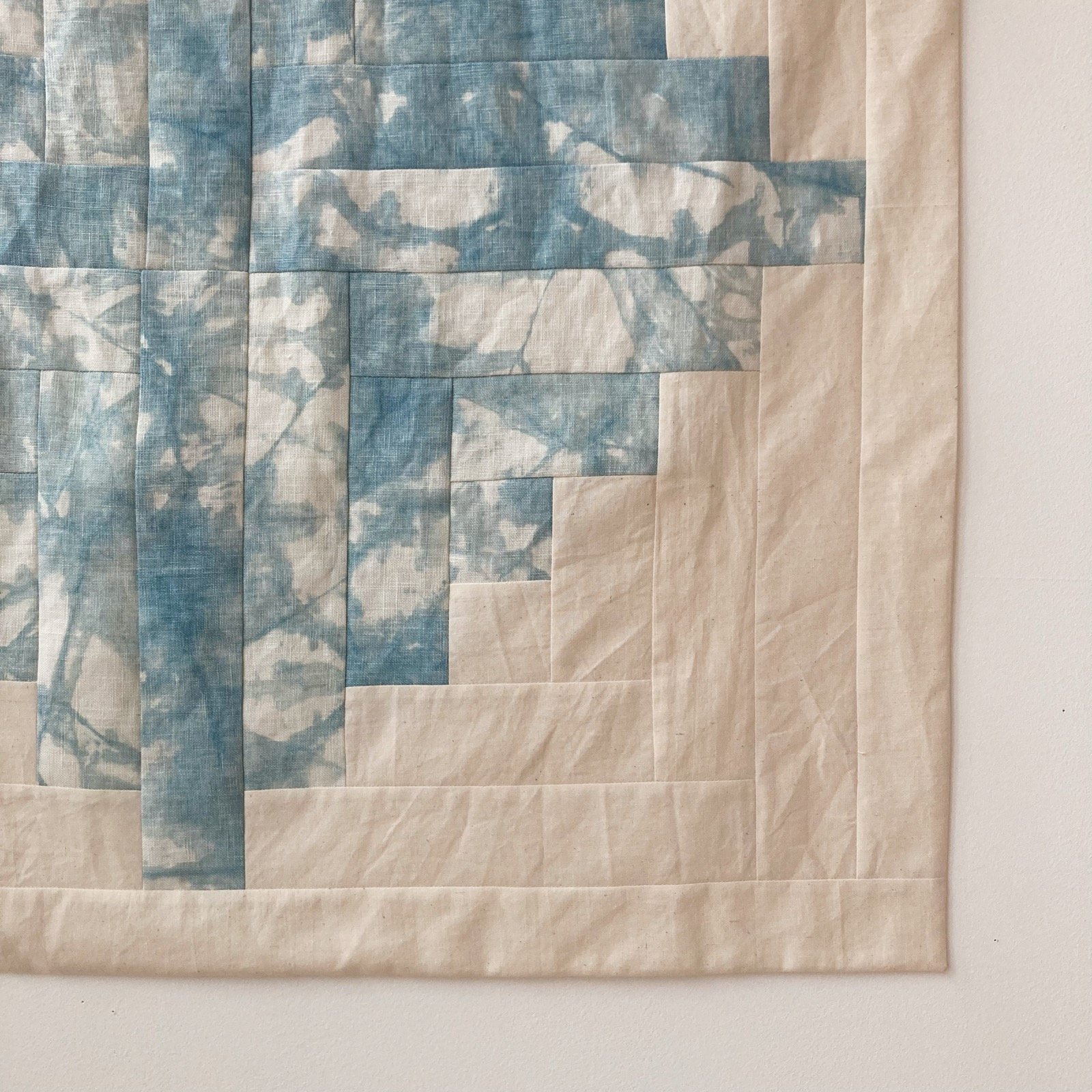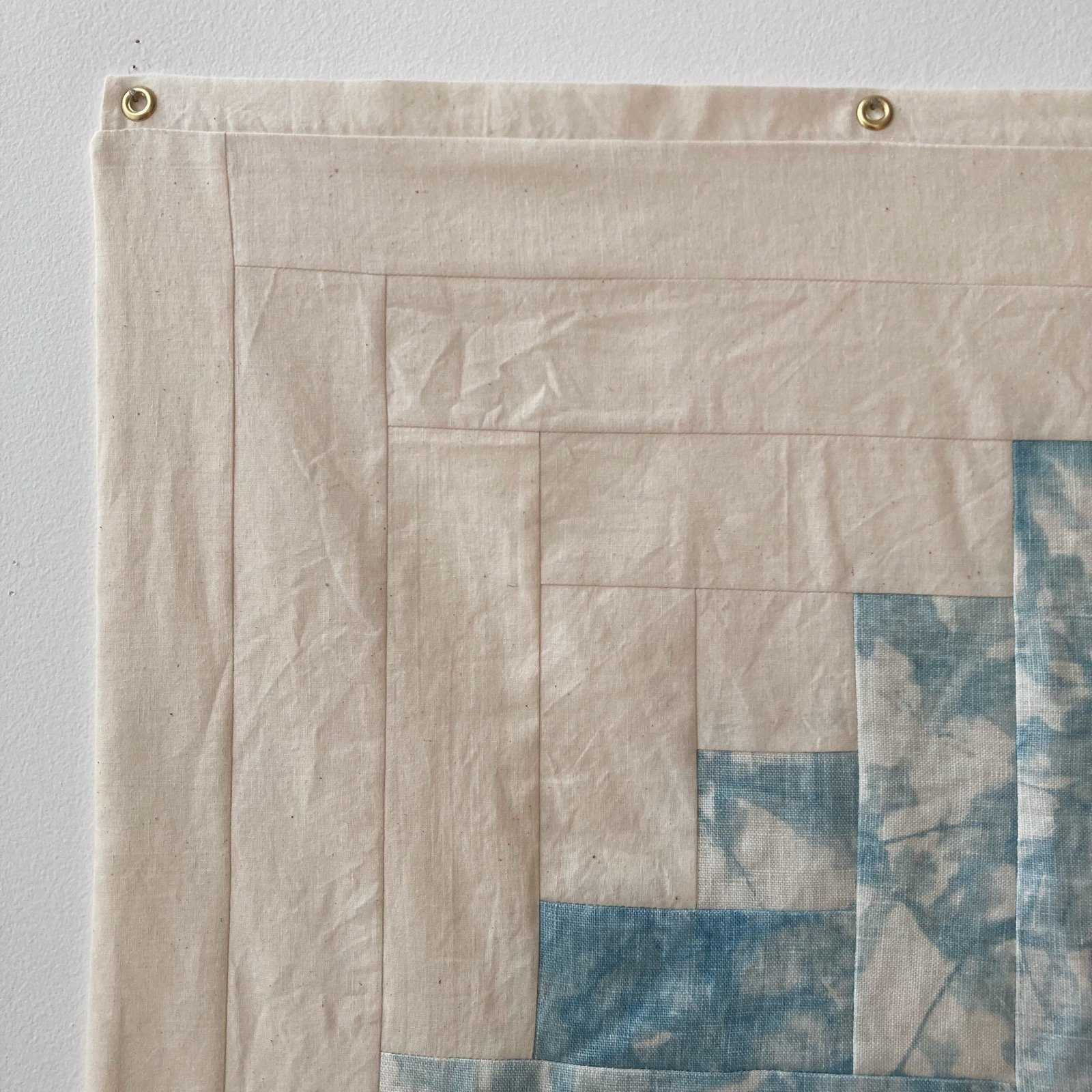 Log cabin quilt wall hanging, made from unbleached cotton and indigo hand-dyed linen. Backed with unbleached cotton.